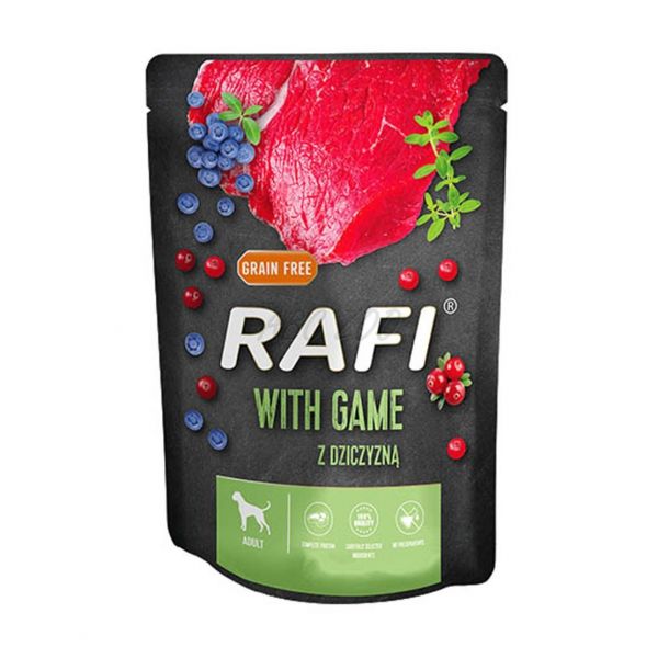 Składniki: mięso i produkty pochodzenia zwierzęcego 65% (dziczyzna 4%), owoce (jagody 2%, żurawina 2%), minerały, oleje i tłuszcze (olej lniany 0,2%), suszony tymianek 0,01%