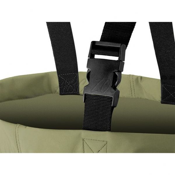 Oprócz standardowych regulowanych szelek, model ten wyposażony jest również w odpinany pas, co pozwala lepiej dopasować się do sylwetki wędkarza. Dodatkową zaletą zapiętego pasa jest ograniczenie ryzyka szybkiego zalania wodą w razie upadku do wody.