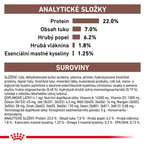 SKŁAD: ryż, odwodnione białko drobiowe, pszenica, jęczmień, hydrolizowane białko zwierzęce, suszona pulpa buraczana, tłuszcze zwierzęce, minerały, produkty drożdżowe, olej rybny, mono- i diglicerydy kwasów palmitynowego i stearynowego estryfikowane kwasem cytrynowym, nasiona i łuski psyllium, fruktooligosacharydy (0,48%), hydrolizowane drożdże (źródło mannanooligosacharydów) (0,19%), ekstrakt z nagietka (źródło luteiny).