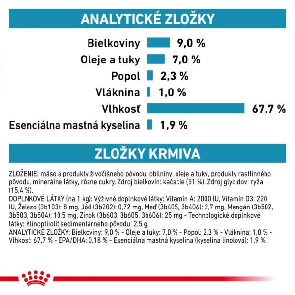 SKŁADNIKI ANALITYCZNE: Białko: 9% - Oleje i tłuszcze: 7% - Popiół: 2,3% - Włókno surowe: 1% - Na kg: EPA/DHA: 0,18% - Niezbędne Nienasycone Kwasy Tłuszczowe (Kwas Linolowy): 1,9%, Wilgotność: 67,7%