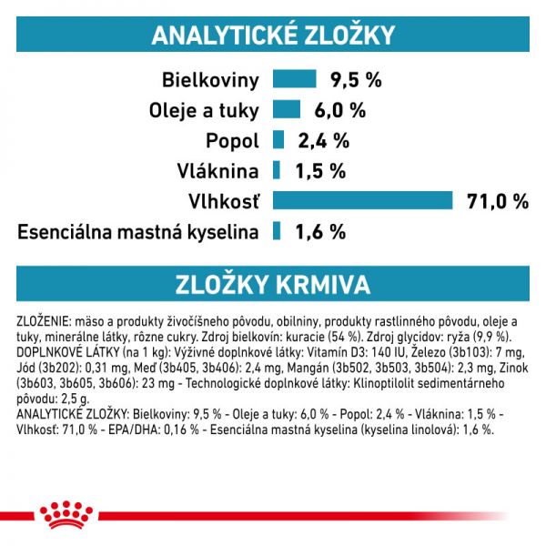SKŁADNIKI ANALITYCZNE: Białko: 9,5% - Zawartość tłuszczu: 6,0% - Popiół surowy: 2,4% - Włókno surowe: 1,5% - Wilgotność: 71,0% - EPA/DHA: 0,16% - Niezbędny kwas tłuszczowy (kwas linolowy): 1,6%.