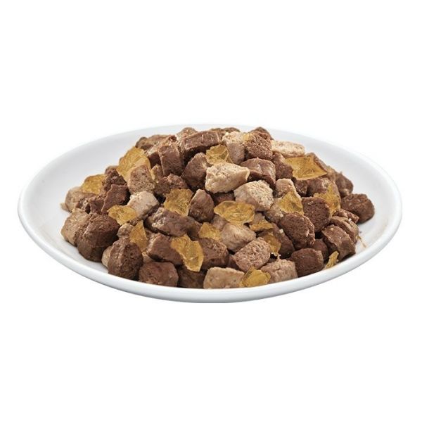 Z WOŁOWINĄ: mięso i produkty uboczne pochodzenia zwierzęcego (4% wołowiny), zboża, koncentraty białka roślinnego, minerały, cukry. Bez barwników i konserwantów.