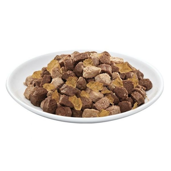 Z KRÓIKEM I INDYKIEM: mięso i produkty uboczne pochodzenia zwierzęcego (4% królika, 4% indyka), zboża, koncentraty białek roślinnych, minerały, cukry. Bez barwników i konserwantów.