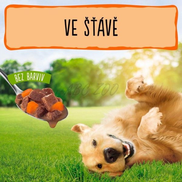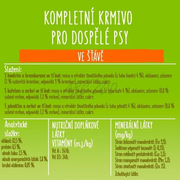 Z jagnięciną i marchewką w soku: mięso i produkty uboczne pochodzenia zwierzęcego (w tym 4 % jagnięciny), zboża, minerały, warzywa (0,8 % odwodnionej marchwi, co odpowiada 7,2 % marchwi), cukry