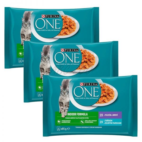 PURINA ONE INDOOR z tuńczykiem i fasolką szparagową w sosie, z cielęciną i marchewką w sosie, 12 x 85 g