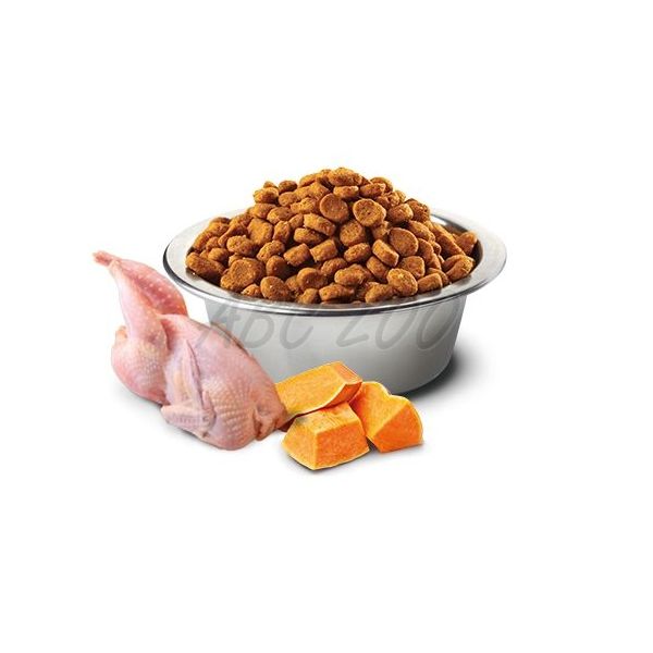 Skład: przepiórka (24%), suszone białko z przepiórki (22%), słodki ziemniak, tłuszcz z kurczaka, suszona dynia (5%), suszone jajko, śledź, suszone białko ze śledzia, olej rybny (ze śledzia), włókno grochu, suszona marchew, mączka z lucerny, inulina, fruktooligosacharydy, ekstrakt drożdżowy (źródło mannooligosacharydów), suszone granaty (0,5%), suszone jabłka, suszony szpinak, psyllium (nasiona i łupiny), suszone słodkie pomarańcze, suszone jagody, chlorek sodu, suszone drożdże piwne, kurkuma (0,2%), ekstrakt z aloesu, glukozamina, siarczan chondroityny.