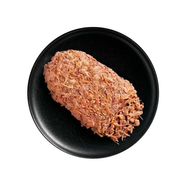 Składniki: mięso z indyka, serce, wątroba, żołądek (34,5%), bulion (34,3%), siekana wołowina (14%), wątroba drobiowa (8,5%), płuca wołowe (7,5%), skorupki jaj, suszone (0,5%), minerały (0,5%), olej z łososia (0,2%)