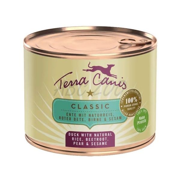 Karma w puszkach Terra Canis z linii CLASSIC zawiera dużą ilość mięsa oraz świeżych warzyw, owoców i ziół. Bogate w składniki odżywcze, lekkie, bezglutenowe pseudozboża (np. proso, amarantus, ryż naturalny) są dodawane w bardzo małych ilościach, które są lekkostrawne dla psa (4-10%). Naturalne składniki (wodorosty, glinka mineralna, pyłek kwiatowy, owoce dzikiej róży, sól andyjska, drożdże piwne) dostarczają ważnych witamin, minerałów i pierwiastków śladowych. Olej rzepakowy dostarcza cennych niezbędnych kwasów tłuszczowych. Wszystkie składniki są w 100% przeznaczone dla ludzi.