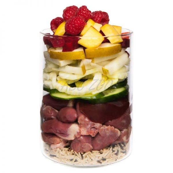Ilość mięsa : ryż naturalny : warzywa/owoc/zioła : inne składniki = 53% : 7% : 37% : 3%