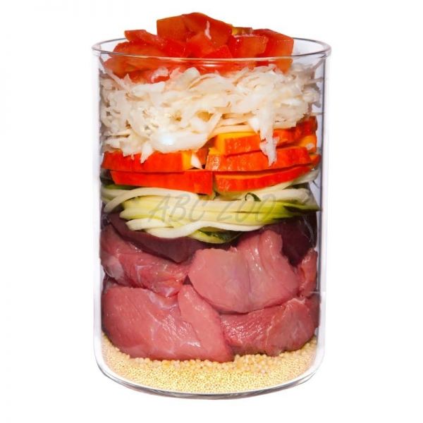 Ilość mięsa : warzywa/owoc/zioła : amarantus + proso : inne surowce = 56% : 32% : 4 + 6% : 2%