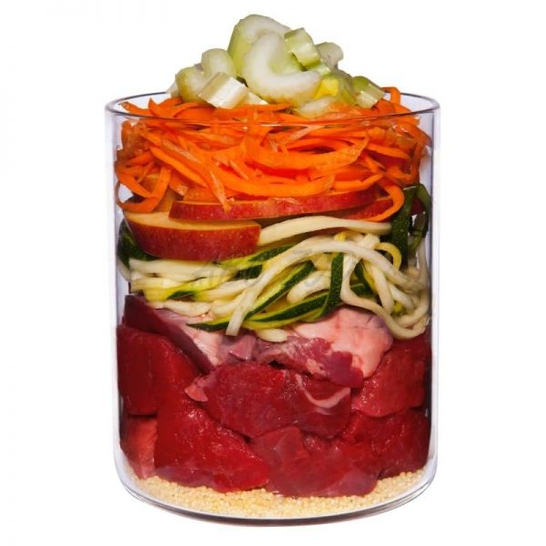 Ilość mięsa : warzywa/owoc/zioła : proso : inne surowce = 46 % : 44 % : 8 % : 2 %