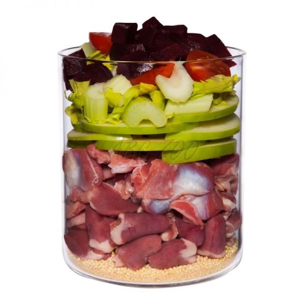 Składniki: Serce z kurczaka (24%), pomidor (17%), żołądek z kurczaka (16%), wątróbka z kurczaka (11%), gruszka, amarantus (5%), mięsień z kurczaka (4%), proso, burak*, łodyga selera, mączka kokosowa, olej rzepakowy, ostrygi*, drożdże piwne*, bazylia* (0,4%), glinka mineralna*, sól andyjska, owoce dzikiej róży*, wodorosty*, minerały