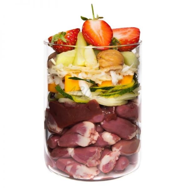 Składniki: Kacze serca (50%), dynia (12%), marchew, kacze wątróbki (6%), cukinia, seler (5%), melon, jabłko, słodki kasztan (1,5%), truskawka (1%), olej rzepakowy, ostrygi*, drożdże piwne*, kwiat czarnego bzu* (0,4%), nasiona psyllium*, rukiew wodna*, mniszek lekarski*, glinka mineralna*, pietruszka*, sól andyjska, wodorosty morskie*, minerały