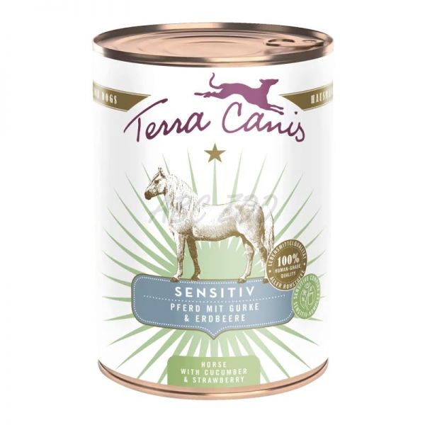 Karmy w puszkach Terra Canis z linii Sensitive są dostosowane do delikatnych psich żołądków, zawierają zredukowaną liczbę składników, aby ułatwić trawienie. Są bezglutenowe i zawierają łatwostrawne mięso uzupełnione zasadowymi składnikami, takimi jak ziemniaki, łatwo przyswajalne warzywa, owoce oraz zioła. Specjalnością jest unikalny kompleks SENSITIVE, który delikatnie i naturalnie wspiera układ pokarmowy, florę jelitową oraz błonę śluzową żołądka.