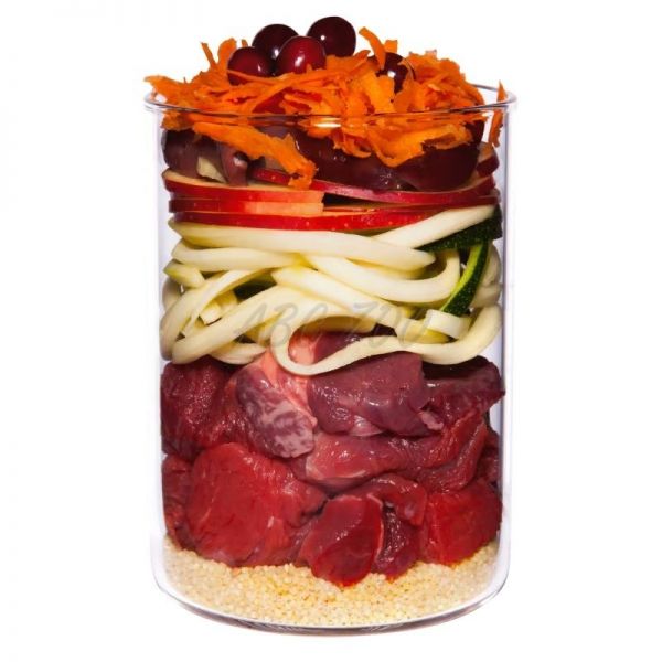 Ilość Mięso : proso : warzywa/owoc/zioła : inne surowce = 56% : 5% : 36% : 3%