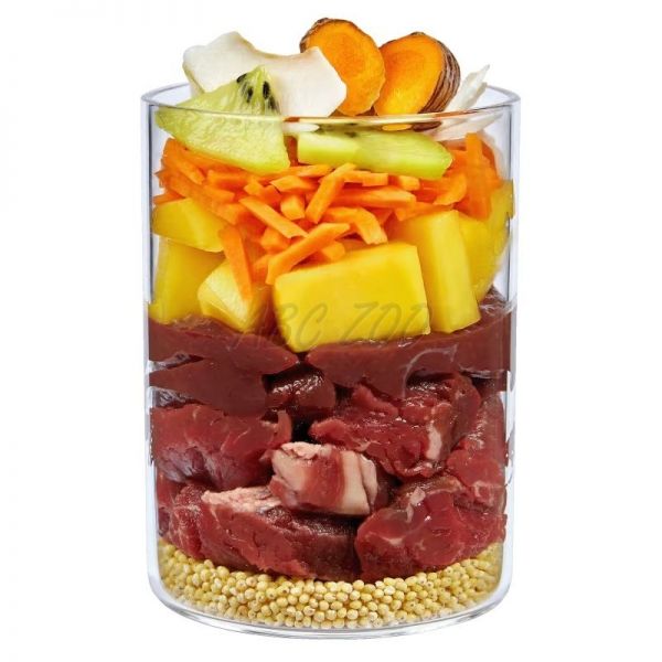 Składniki: serce wołowe (35%), marchew, cukinia, płuca wołowe (11%), wątroba wołowa (8%), proso (5%), słodki ziemniak, jabłko (5%), mango (2%), brzoskwinia (2%), kiwi (2%), melon (2%), mączka kokosowa (1%), olej rzepakowy, drożdże piwne*, ostrygi*, nasiona słonecznika (0,3%), lawenda*, majeranek*, tymianek*, portulaka pospolita*, kurkuma* (0,1%), spirulina*, glinka mineralna, wodorosty morskie*, składniki mineralne