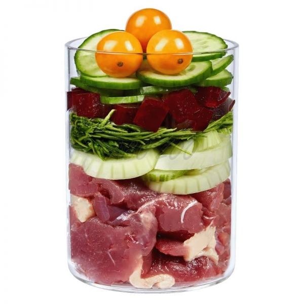 Składniki: Serce z kaczki (50%), marchew, ziemniak (11%), wątroba z kaczki (7%), ogórek, jabłko, burak (3,5%), melon, truskawka, mąka kokosowa, ostryż* (0,3%), rokitnik* (0,2%), dzika róża* (0,2%), koper włoski*, lawenda*, szałwia*, proszek z koralowca Sango* (0,1%), sól andyjska, glinka mineralna*, wodorosty*, minerały