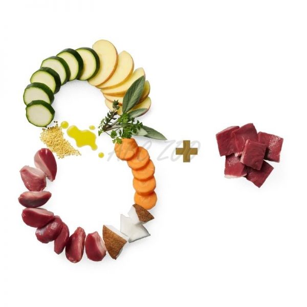 Essential 8 to osiem niezwykle zdrowych niezbędnych składników dla psów, które razem tworzą zbilansowane psie menu, które pysznie pachnie i świetnie smakuje. Podstawę stanowią dwa wartościowe mięsa, które łączą w sobie najlepsze z dwóch źródeł białka. Do mięsa dołącza sześć innych wspaniałych składników: proso, marchewka, cukinia, jabłko, olej rzepakowy, mąka kokosowa i zioła, takie jak tymianek, rukiew wodna i szałwia.