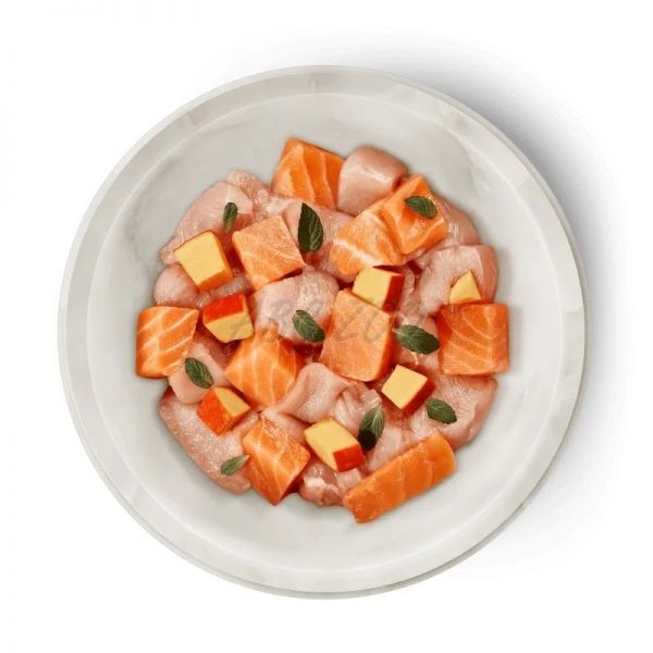 Składniki: Filet z łososia (62%), wątróbka z kurczaka (15%), mięsień z kurczaka (8%), skóra z kurczaka (6%), dynia piżmowa (4%), pomidor w proszku, catnip*