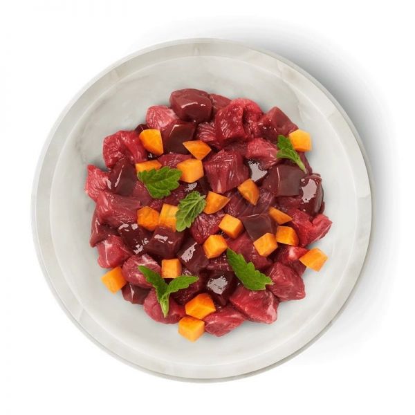 Składniki: Serce wołowe (71%), wątroba wołowa, mięśnie wołowe (6%), marchew (4%), pomidory w proszku*, olej rzepakowy, olej rybny, ogon wołowy*, minerały