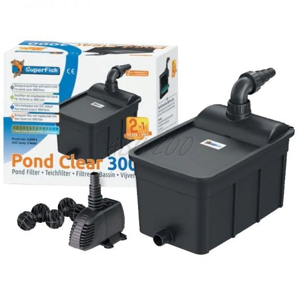 SuperFish Pond Clear kit 3000 to wysoce skuteczny system filtracyjny składający się z filtra z lampą UV-C wbudowaną w górną pokrywę oraz pompy. Jest przeznaczony do stawów o pojemności do 3000 litrów (dla stawów bez ryb). Ten kompaktowy i wydajny zestaw łączy filtrację mechaniczną, biologiczną i UV, zapewniając krystalicznie czystą wodę oraz zdrowe środowisko dla ryb i roślin.