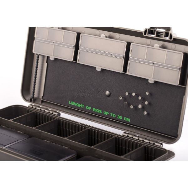 Pokrywa organizera posiada wytrzymałe, zamykane przegródki, oferując jednocześnie kompletną tackę na smycz z tacką na haczyk, sekcją piankową 270 x 80 mm, 10 pinezkami i zintegrowaną linijką.