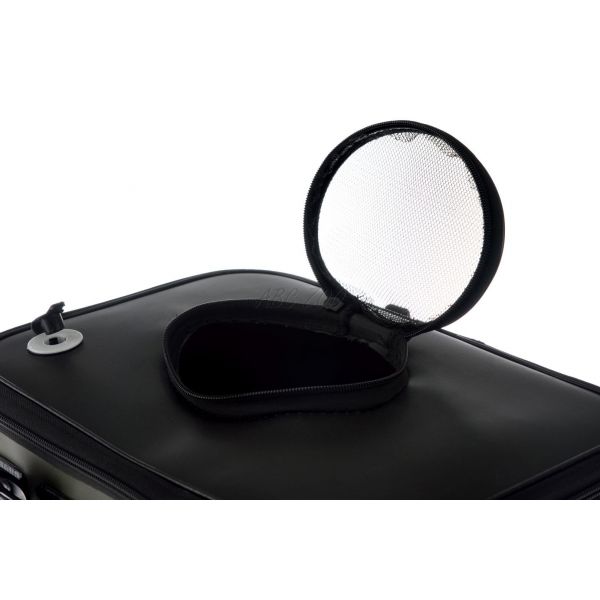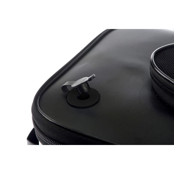 W pokrywie znajduje się również drugi otwór, przez który można przeprowadzić rurkę do napowietrzacza – można go dokupić osobno i bez problemu używać z tą torbą. Na bocznej stronie torby znajduje się zewnętrzna kieszeń, która pomieści napowietrzacz. Torba ma dwa mocne uchwyty z tworzywa sztucznego, które można złączyć, co ułatwia przenoszenie i transport. Ta nowa torba przypadnie do gustu wszystkim, którzy chcą przewozić żywce nad wodę, ale świetnie sprawdzi się również jako większe wiadro dla każdego wędkarza.