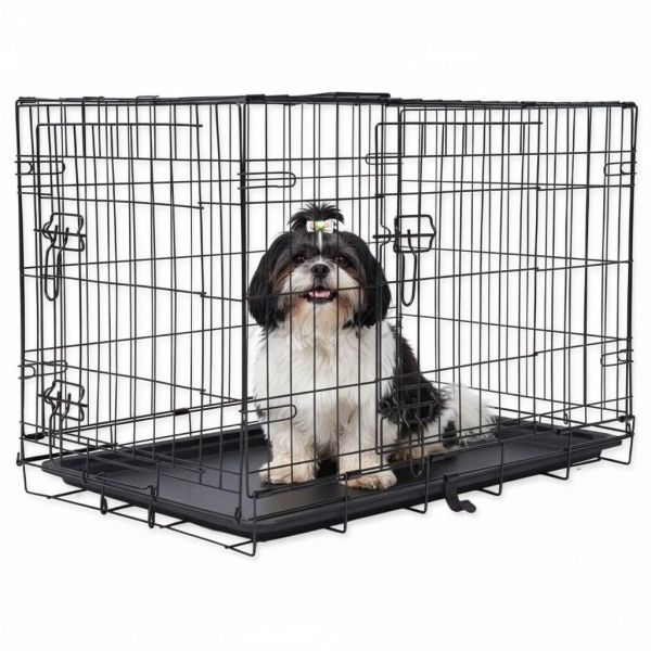 Klatka składana w kolorze czarnym, podwójne drzwi. Szczegółowy opis