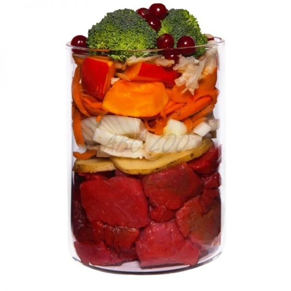 Składniki: mięso z dziczyzny (63%), marchew, dynia (5%), ziemniak, pasternak, koper włoski (4%), seler, olej rzepakowy (3%), brokuły, żurawina, mąka kokosowa, liście karczocha*, szałwia* (0,4%), nagietek*, mniszek lekarski*, pokrzywa*, ostryż*, sól andyjska, wodorosty*, minerały