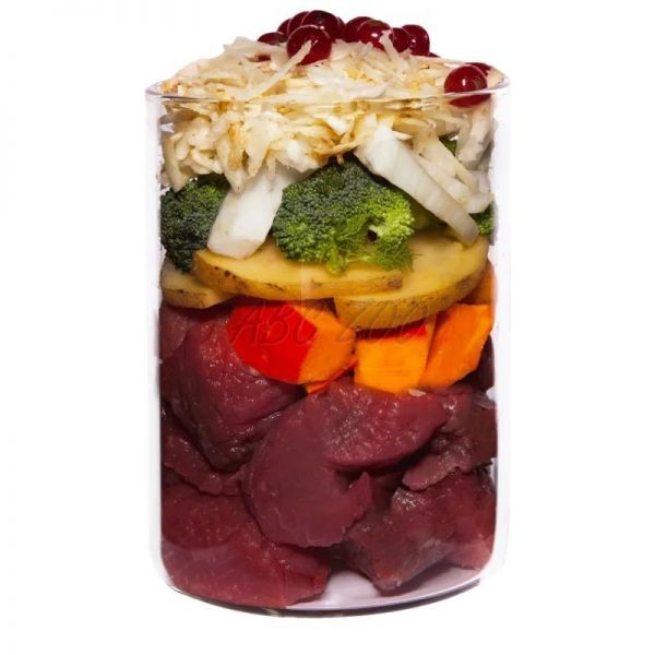 Składniki: Mięso z mięśni końskich 52%, bulion 22%, ziemniaki 4%, dynia 4%, marchew 4%, koper włoski 3%, seler 2%, olej rzepakowy 2%, brokuły 2%, minerały 1%*, borówka brusznica, pasternak*, mąka kokosowa*, liść karczocha*, szałwia*, nagietek*, mniszek lekarski*, pokrzywa*, bazylia*, muszle ostryg*, spirulina*