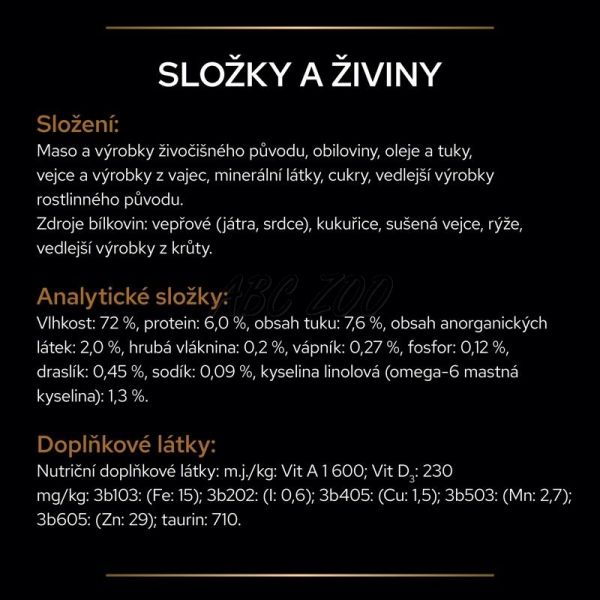 Składniki: Mięso i produkty uboczne pochodzenia zwierzęcego, Zboża, Jaja i produkty uboczne z jaj, Minerały, Oleje i tłuszcze, Cukry, Produkty uboczne pochodzenia roślinnego, Źródła białka: Wieprzowina (wątroba i serca), Kukurydza, Suszone jaja, Ryż, Produkty uboczne z indyka
