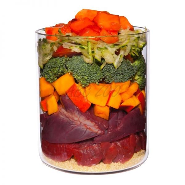 Składniki: mięso bawole (46%), dynia, wątroba bawola (9%), proso (7%), cukinia, dojrzałe pomidory (7%), brokuły, papaja (2%), olej rzepakowy, drożdże piwne*, ostrygi*, mielone siemię lniane, szałwia*, mniszek lekarski*, glinka mineralna*, sól andyjska, wodorosty morskie*, minerały