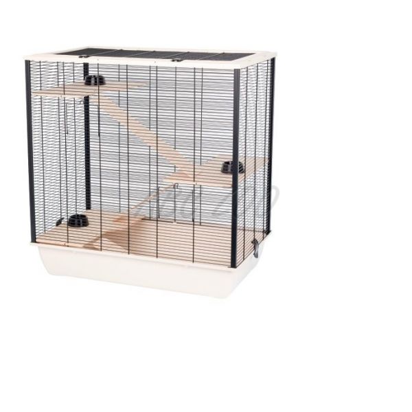 Składana klatka nie tylko dla fretki, ale także dla różnych gryzoni. Drewniane akcesoria i plastikowe miski. Beżowy kolor wanienki. Szczegółowy opis