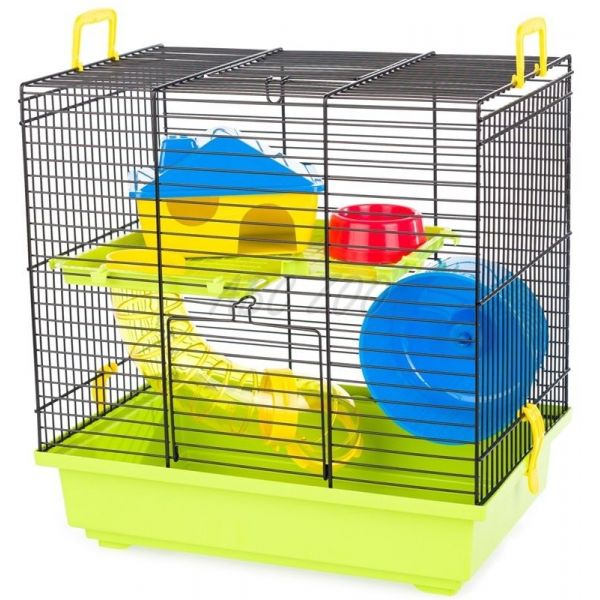 Piętrowa klatka dla chomików, wyposażona w tunel, w miskę w domek i w kołowrotek. Zielony kolor wanienki. Szczegółowy opis