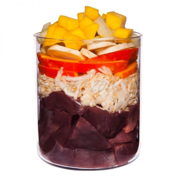 Składniki: serca cielęce (43%), płuca cielęce (13%), pietruszka (10%), dynia, melon spadziowy, pasternak, mango (3,5%), mąka kokosowa, czarna porzeczka (0,7%), olej rzepakowy, mączka z pestek dyni, ostrygi*, drożdże piwne*, szałwia* (0,2%), sól andyjska, mniszek lekarski*, nasiona kopru włoskiego*, rukiew wodna*, glinka mineralna*, wodorosty morskie*, minerały