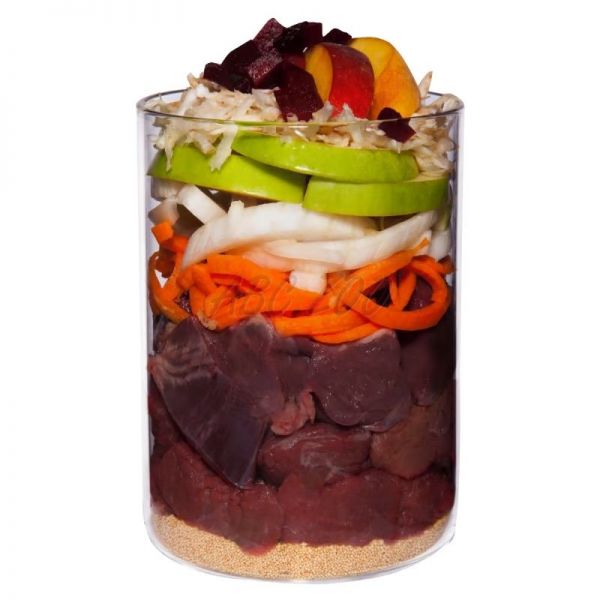 Składniki: Mięśnie konia (51%), marchew, seler, amarantus (9%), koper włoski, jabłko, brzoskwinia (5%), burak* (3%), olej rzepakowy, drożdże piwne*, ostryż*, tymianek*, rokitnik*, sól andyjska, glinka mineralna*, wodorosty*, minerały