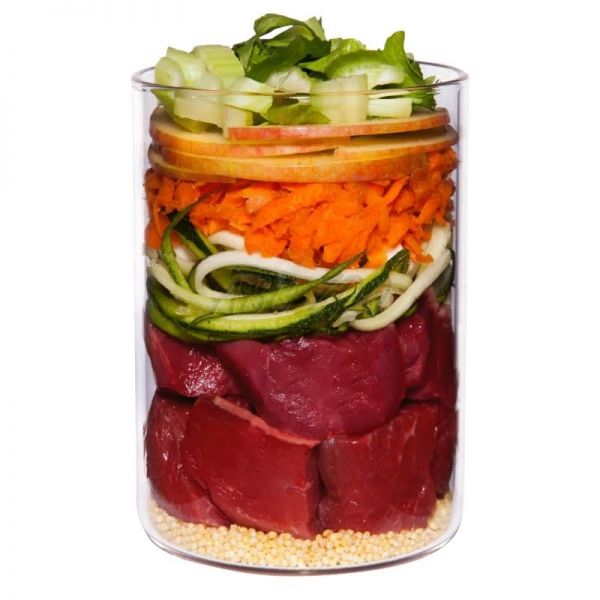 Ilość mięsa : warzywa/owoc/zioła : proso : inne surowce = 46 % : 44 % : 8 % : 2 %