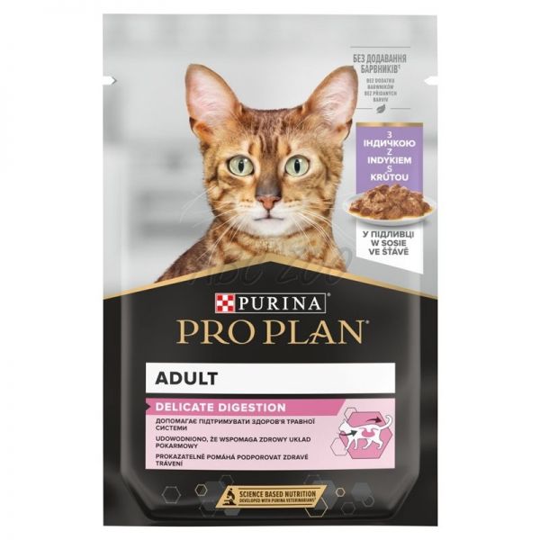 PURINA® PRO PLAN® Adult Delicate Digestion z indykiem w soku, dzięki wysokiej zawartości kwasów tłuszczowych omega-3 i 6, wspomaga prawidłowe trawienie i pomaga radzić sobie z wrażliwą skórą.