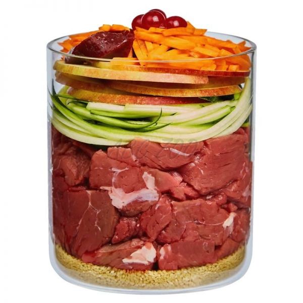 Składniki: Serce wołowe (30%), płuco wołowe (14%), cukinia, marchew (11%), wątroba wołowa (7%), proso, mięsień wołowy (5%), jabłko (4%), olej rzepakowy, mąka dyniowa (1%), ostrygi*, drożdże piwne*, żurawina, bazylia*, pietruszka*, ziemia okrzemkowa*, sproszkowane owoce dzikiej róży* (0,2%), glinka mineralna*, sól andyjska, wodorosty*, minerały