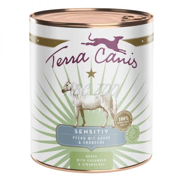 Karmy w puszkach Terra Canis z linii Sensitive są dostosowane do delikatnych psich żołądków, zawierają zredukowaną liczbę składników, aby ułatwić trawienie. Są bezglutenowe i zawierają łatwostrawne mięso uzupełnione zasadowymi składnikami, takimi jak ziemniaki, łatwo przyswajalne warzywa, owoce oraz zioła. Specjalnością jest unikalny kompleks SENSITIVE, który delikatnie i naturalnie wspiera układ pokarmowy, florę jelitową oraz błonę śluzową żołądka.
