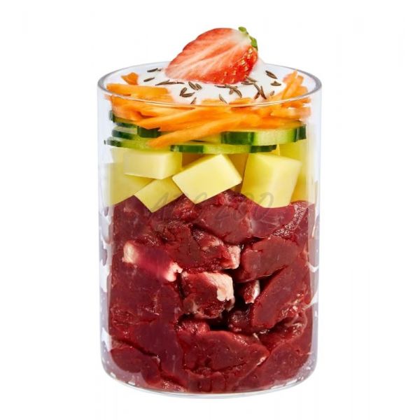 Skład: mięso konia 46%, bulion 20%, marchew 9%, ziemniaki 7%, ogórek 6%, melon 3%, truskawki 3%, probiotyki (mieszanka Emiko® EM) 1%, olej rzepakowy, czarnuszka*, glinka mineralna 0,4%*, łuski pysllium 0,2%*, kminek 0,1%*, lebiodka*, bazylia*, muszla ostrygowa*, kora wiązu czerwonego 0,1%*, anyż 0,1%*, spirulina*