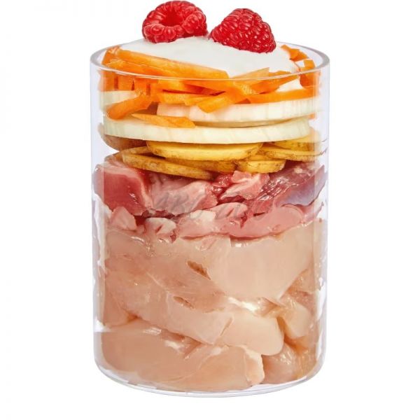 Składniki: Serce z kurczaka (33%), żołądek z kurczaka (20%), marchew, ziemniak (9%), mięsień z kurczaka (7%), koper włoski, gruszka, malina (4%), mąka kokosowa (2%), olej rzepakowy, mleko kozie (1%), probiotyki (Emiko® EM Mix) (0,