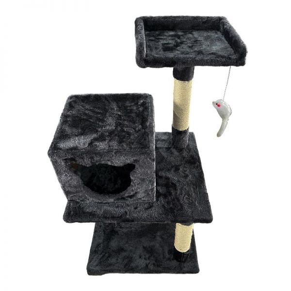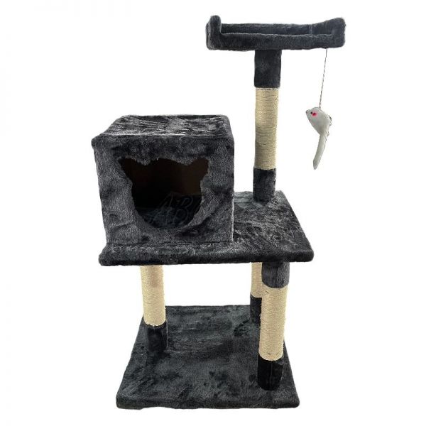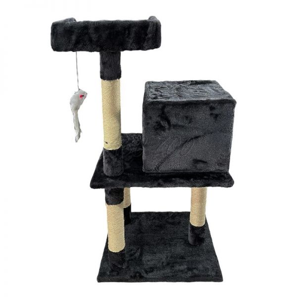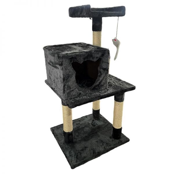 Ta stabilna i kompaktowa drapaczka oferuje wszystko, czego potrzebuje Twój kot do codziennej zabawy i relaksu. Na dole znajduje się przytulny domek do spania z uroczym wejściem w kształcie kociej głowy, podczas gdy górna platforma umożliwia wygodny odpoczynek z widokiem. Nie brakuje również zabawnej pluszowej myszki zawieszonej na sznurku, która wspiera instynktowną zabawę i aktywność Twojego kota.
