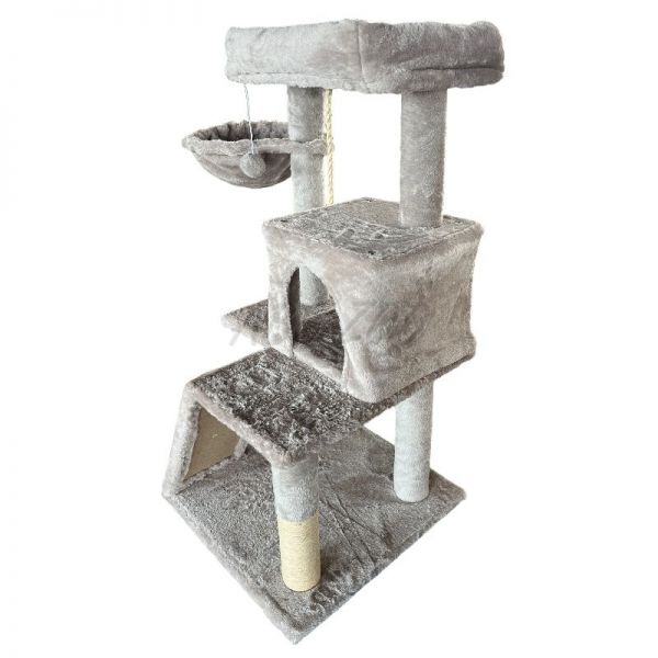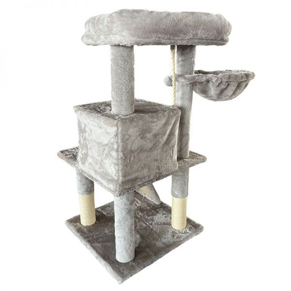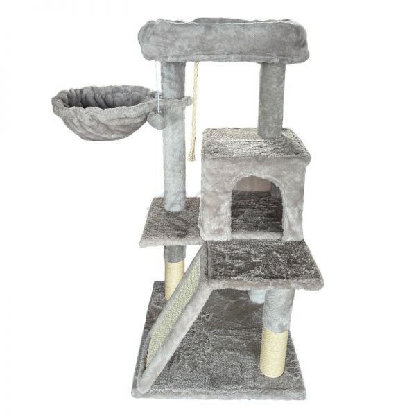 Ten drapak oferuje przestronną budkę, przytulny domek do chowania się, miękkie zawieszone legowisko oraz piłkę do zabawy, dzięki czemu staje się idealnym miejscem do zabawy i relaksu. Słupki pokryte sizalem pomagają kotu naturalnie ostrzyć pazurki bez uszkadzania mebli. Dzięki nachylonej powierzchni do drapania i kilku poziomom jest odpowiedni również dla starszych lub mniej ruchliwych kotów.