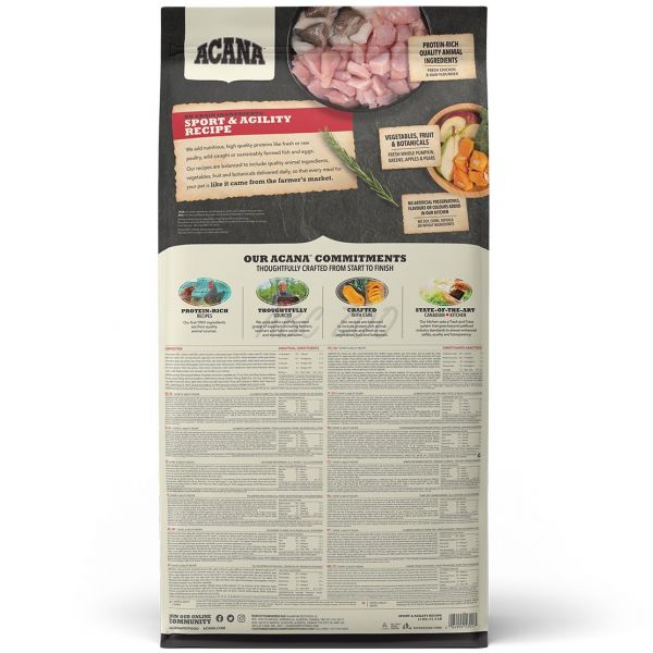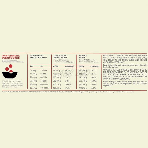 Składniki: Świeże mięso z kurczaka (20%), mączka z kurczaka (20%), cała czerwona soczewica, cały zielony groszek, tłuszcz z kurczaka (8%), mączka z indyka (7%), świeże podroby z kurczaka (wątroba, (4%), odwodniony śledź (4%), jaja (4%), surowa gładzica (4%), olej rybny (3,5%), cała ciecierzyca, cała zielona soczewica, cały żółty groszek, skrobia grochowa, surowa wątroba z indyka (0,5%), sól, suszony jarmuż, świeża cała dynia, świeża cała dynia, świeża cała marchew, świeże całe jabłka, świeże całe gruszki, świeża cała cukinia, suszony korzeń cykorii, świeży jarmuż, świeży szpinak, świeże buraki, świeże buraki, świeże całe żurawiny, świeże całe jagody, świeże całe jagody saskatoon, kurkuma, ostropest, korzeń łopianu, lawenda, korzeń hibiskusa, dzika róża
