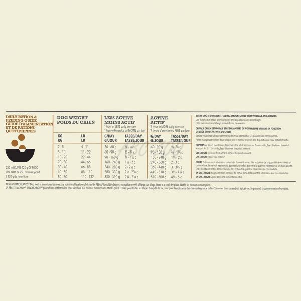 Skład: świeża wołowina Angus 9%, surowa jagnięcina 8%, świeża wieprzowina 8%, dehydrowane mięso wołowe 8%, dehydrowane mięso jagnięce 8%, dehydrowane mięso wieprzowe 7%, cały groszek zielony, cała czerwona soczewica, cała ciecierzyca, tłuszcz wołowy 5%, świeża wątrobwa wołowa 4%, świeży bizon 4%, świeży sandacz 4%, cała zielona soczewica, cała fasola pinto, cały żółty groch, lucerna suszona na słońcu, świeże wołowe nerki 2%, olej z dorsza 2%, włókno z soczewicy, suszone chrząstki wołowe 1%, surowe flaczki jagnięce 1%, suszone wodorosty morskie, świeża dynia, świeża dynia masłowa, świeży pasternak, świeża kapusta, świeży szpinak, świeże liście gorczycy, świeże liście rzepy, świeża marchew, świeże jabłka red delicious, świeże gruszki bartlett, liofilizowana wątroba (wołowa, jagnięca, wieprzowa) 0,1%, świeża żurawina, świeże jagody, cykoria, kurkuma, ostropest, łopian, lawenda, hibiskus, róża dzika