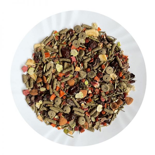 Składniki: lucerna, owoce (owoce dzikiej róży, jarząb pospolity, rodzynki, jabłka, banany), ekstrudowana pszenica, ekstrudowana kukurydza, płatki grochu, chleb świętojański, warzywa (pietruszka, marchew), płatki pszenne, owies, jęczmień.
