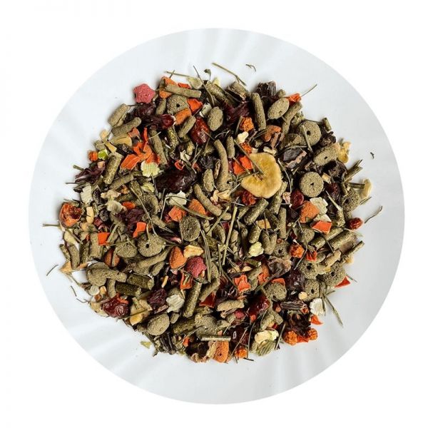 Selektywna i zbilansowana mieszanka paszowa dla świnek morskich odpowiednia do długotrwałego karmienia, bogata w całe warzywa, owoce, chrupki i krążki koniczyny.