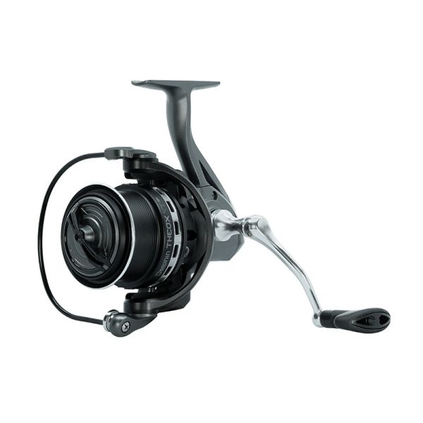 Wolny hamulec przedni pozwala na precyzyjną regulację podczas holowania. Metalowa korbka z systemem Screw-In eliminuje luz, a gumowana rączka zwiększa komfort użytkowania. Ciemny, elegancki design ze srebrnymi detalami podkreśla wysoką funkcjonalność i czyni z THEOX niezawodnego partnera na każdy połów.