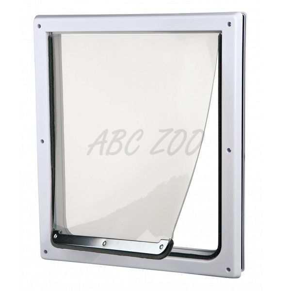 Białe, plastikowe drzwiczki dla psów dużych ras, mogą być zamknięte przy pomocy blokady. Szczegółowy opis